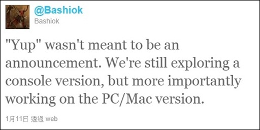 Bashiok「"Yup"並不代表正式宣布。我們仍在探討家機版本的可能性,但是 PC/Mac 版本的研發才是我們的首要工作。」