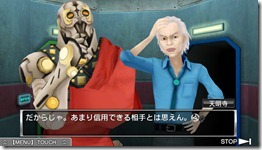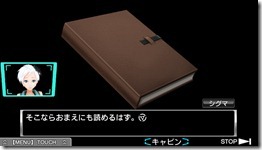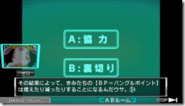 逃脫部分 每次在 CD 選擇之前,都會安排一段思考型的解謎遊戲,逃脫成功之後就能獲得參加 AB 遊戲的卡片(キーカード),用來解開謎題的關鍵道具往往都藏在房間裡最不起眼的角落中,收集道具並根據線索來構思脫逃方式也是本作的最大樂趣之一。 遊戲中處處藏有協助玩家解謎的提示訊息,道具的組合、運用和迷你遊戲也都是脫逃成功的關鍵;特別要注意的是,故事推進的過程中,將會遇到某些特定的「劇情鎖(シナリオロック)」而無法繼續進行下去(畫面上將會顯示 TO BE CONTINUED… 字樣),這時可能就需要先利用流程圖系統跳往別的路線(平行世界),滿足所需條件之後才能夠將其解開。